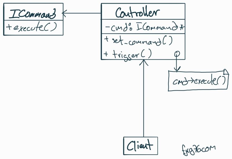 1. (Línea 4) Una variable miembro de tipo ICommand* (o referencia equivalente) que almacena el comando que debe ejecutarse. Es el puente que conecta al controlador con la acción encapsulada.