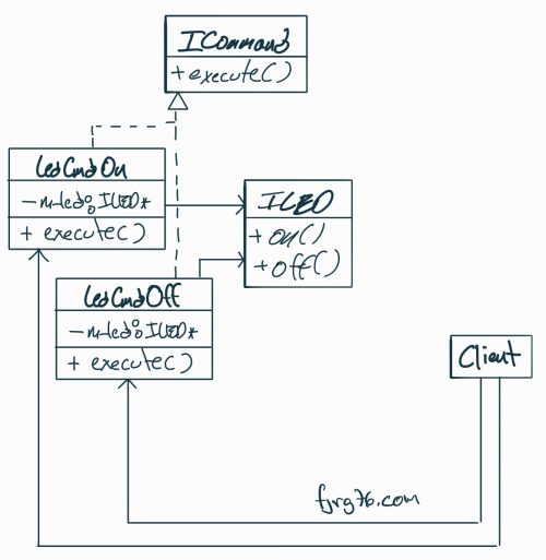 • Línea 8: Creamos la clase concreta que hereda de ILED. Por su nombre, asumimos que controla un LED real conectado directamente a un pin del microcontrolador. Sin embargo, el punto clave del patrón es este: el comando no sabe ni le importa si el LED es real, virtual, simulado o parte de un expansor de pines. Sólo sabe que puede llamar a on() y off() y que un LED se va a encender o apagar, respectivamente.