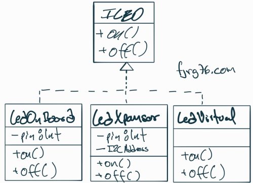 Esta idea no está reflejada en este artículo porque he querido mantener simple el ejemplo, pero en todos los casos anteriores las clases deberán implementar las funciones on() y off(), con lo cual un intercambio de LEDs será mucho más fácil.